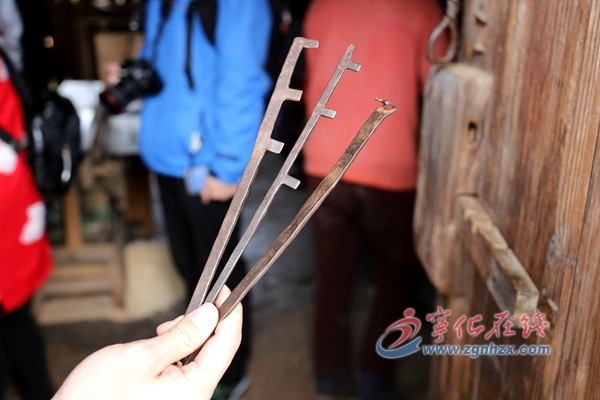 ? ? 在梁聯求帶領下,記者隨同一名村民來到一座谷倉門口,只見她拿出一根根細長的鐵片捅木門上的木栓,說是用鑰匙開鎖。記者發現,婦女手上的鐵片有參差不齊的“齒”,齒的大小、齒與齒之間的不同距離,決定了門鎖的不同。門鎖只是一塊凸起的方木,幾個小孔,木栓一插,竟能將兩扇木門鎖得嚴嚴實實。