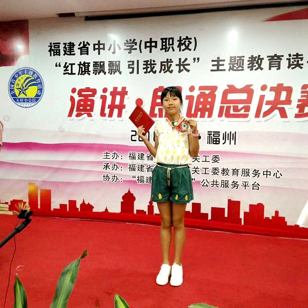 ? ? 7月17日,由福建省教育系統關工委主辦的福建省中小學“紅旗飄飄,引我成長”主題教育讀書活動之演講·朗誦總決賽在福州舉行。經過激烈角逐,寧化縣實驗小學參賽選手巫雨珊同學獲得小學組二等獎。