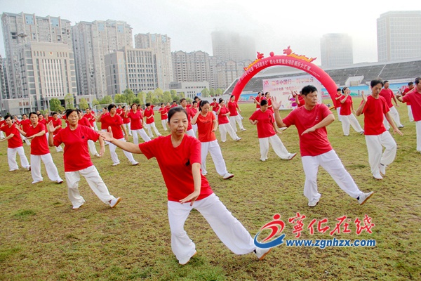 ? ? 上午7時,全縣百名太極拳、健身氣功愛好者齊聚體育中心操場上,迎著朝陽,表演了太極拳、太極柔力球、太極劍、健身氣功“八段錦”、有氧健身操等項目,給在場觀眾帶來了一場視覺盛宴。