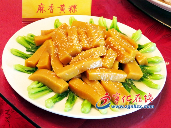 ? ? 年糕(又叫糖糕)寓意“年年高”。制作糖糕程序較繁瑣,剛出籠的糖糕黃澄澄、圓溜溜,在糕的表面還要抹上紅糖水,使之金燦燦、鮮亮亮。趁熱食用軟軟酥酥的年糕,甜甜的、韌韌的、黏黏的,滋味令人難忘。
