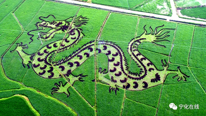 該畫卷以50畝稻田為畫布,用紫色、淺黃、綠色3種水稻穿插種植,勾畫出“嬌龍翱翔”圖案和河龍貢米的地理標志證明商標,該龍總長111.68米,寬71米,繞龍一圈1526.87米。(黃尉峰 范日樑 攝影報道)