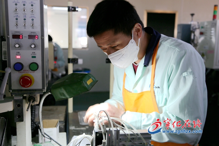 2月19日,在三明福特科光電有限公司機加工車間的復合車銑加工中心,工人們正在抓緊加工生產紅外線體溫檢測儀的鏡頭。