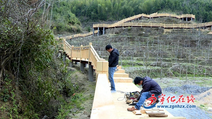 3月2日,在寧化縣城南鎮上坪村悠然南山森林康養項目施工現場,工人正忙著施工,有的安裝木棧道,有的在綠道植樹,還有的正在修建景觀橋。項目已完成總工程量的60%,預計在清明前后初步開放。