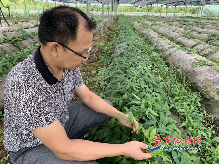 近日,在寧化淮土鎮團結村生態農場,家家果蔬有限公司工作人員正在細心察看三葉青種植情況。