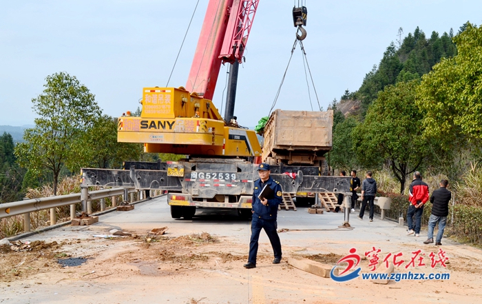 當天下午14時10分許,在起重吊車到達現場之后,寧化公路中心路產工作人員和肩頭嶺班站工人立即在道路兩側按規范擺放警示標志,并安排人員協助維持交通秩序,方便吊車作業。在起吊作業完成后,養路工人又緊急投入到路面清理當中,經過近70分鐘的緊張作業,該路段恢復了暢通。