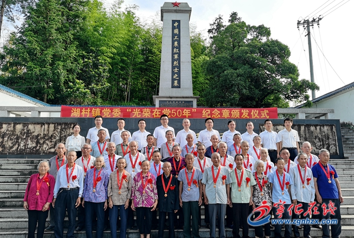 在湖村鎮石下村烈士紀念園分會場,縣人大常委會主任廖祥初為在黨50年黨員代表頒發紀念章。現場黨員與“光榮在黨50年”黨員代表一起重溫入黨誓詞。