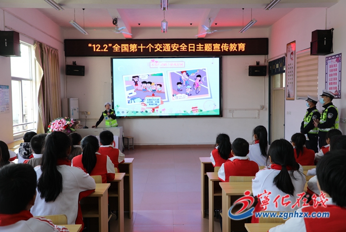 交警們針對師生的出行特點,利用PPT向師生們講解了交通標志、交通手勢所表示的含義,以及如何正確佩戴安全頭盔、系好安全帶,為師生上了一堂別開生面的交通安全課。
