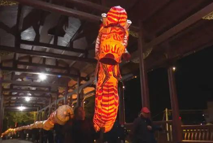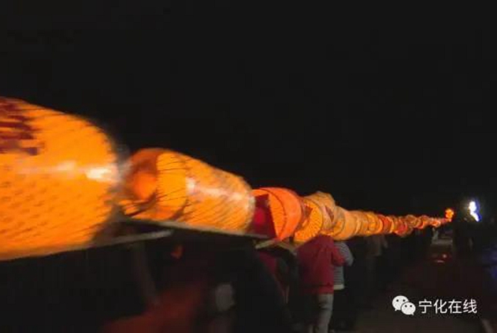 夜晚降臨,村民們舞起兩條長長的板凳龍,它們像兩條長龍翻騰飛躍,燈光閃耀,它們所到之處,村民們都熱情迎接,整個村里喜慶祥和,洋溢著濃濃年味。