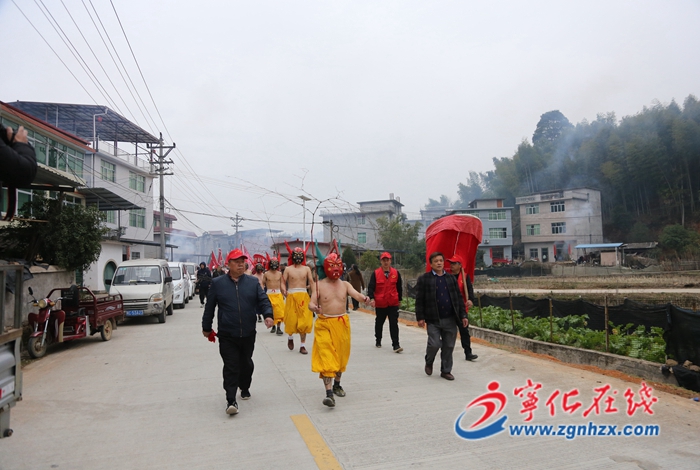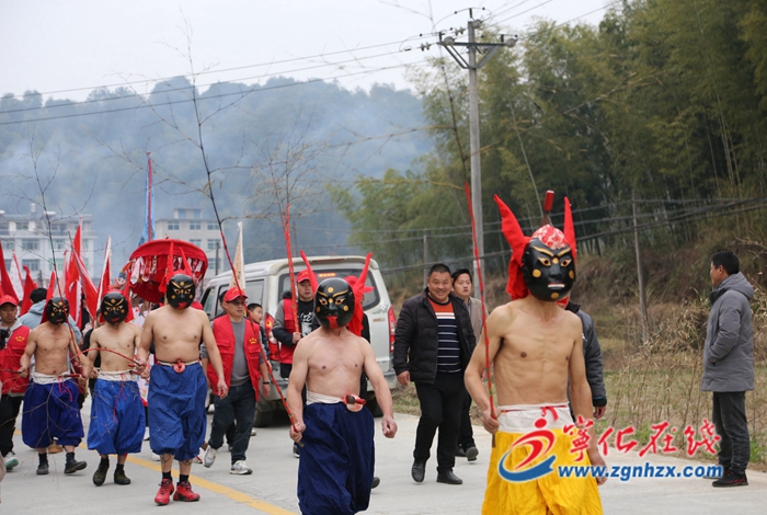 2月3日上午9時(shí)許,在一聲震耳的銃響后,“儺神”面具裝扮完成,七位儺神依次手舞足蹈地從吳氏祖堂大門跳出來,各手持一枝“祈福鞭”左右揮動(dòng),群眾們主動(dòng)上前接受輕輕鞭拂,以示得到平安。隨后,游儺隊(duì)伍由牌子鑼鼓開道,七位“儺神”排成一字縱隊(duì),眾多孩童組成隊(duì)伍手擎彩旗緊隨其后,開始沿著村子巡游,村民紛紛燃放鞭炮焰火,向儺神作揖祈福。