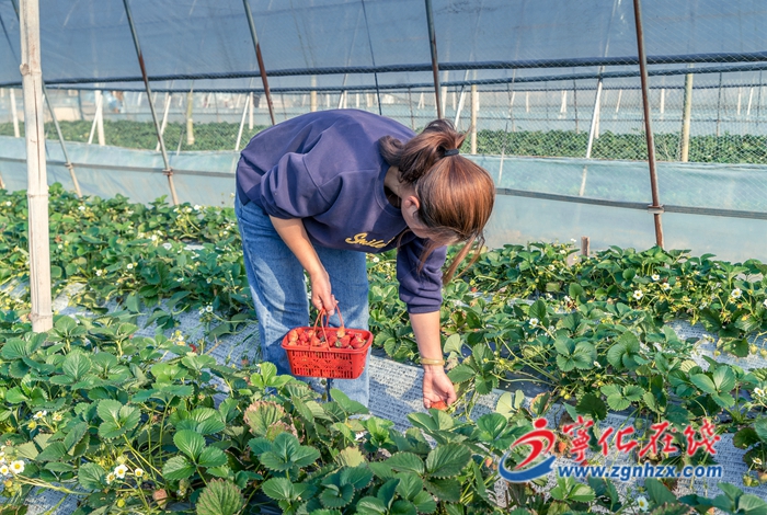 紅顏牛奶草莓色澤亮麗、果肉細嫩多汁,深受市場青睞,因此第一年張小芳就選擇了這個品種開始大面積種植。栽苗、修葉、松土……一次次辛勤的勞動,凝聚著她對豐收的期待。