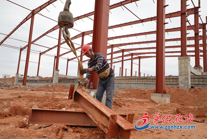 4月10日,在寧化縣城郊鎮新型陶瓷產業鏈項目建設現場,工人正抓緊進行廠房鋼架施工。