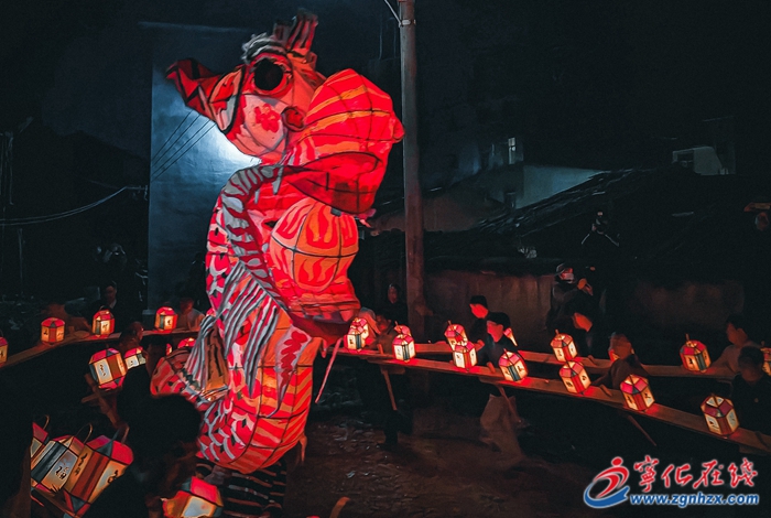吃過晚飯后,滑石村中各戶男丁便身扛燈板到宗祠集合,安置蠟燭,并將“龍身”與“龍頭”“龍尾”連接。完成后,龍燈從祠中游出,開始走村串戶的舞龍表演,龍燈所到之處,鑼鼓鏗鏘,爆竹轟鳴,家家戶戶接龍祈福。