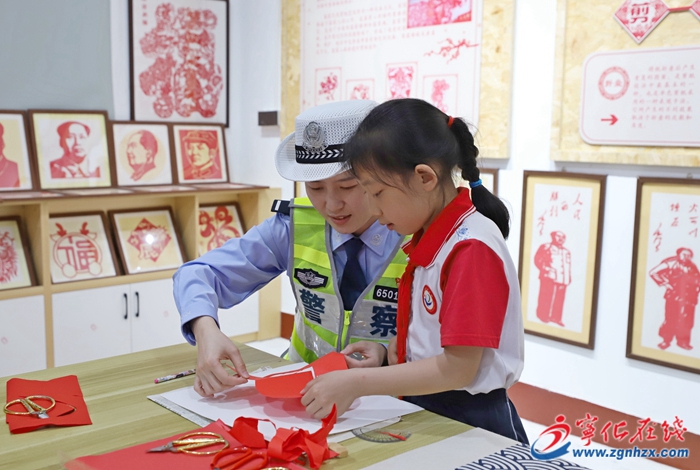 交警大隊民警和學生們一起動手創作,一張張薄薄的紅紙在他們的手上蛻變成了交通安全剪紙,民警們通過剪紙作品向學生們講解交通安全知識,提高孩子們的自我保護意識。