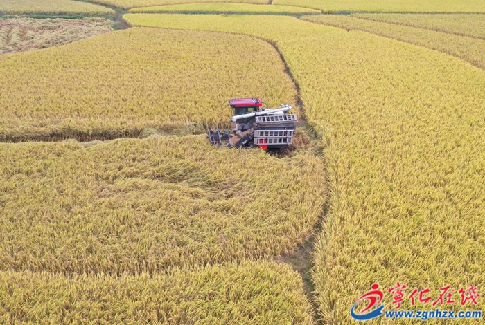 近日,在石壁鎮(zhèn)陂下村的連片稻田里,收割機來回穿梭,一排排稻子連桿帶穗被卷入機械中,割稻、脫粒、粉碎、裝袋等工序一氣呵成。