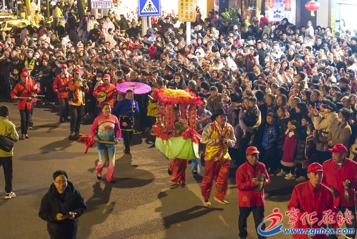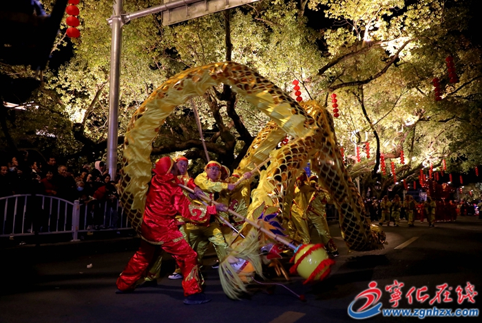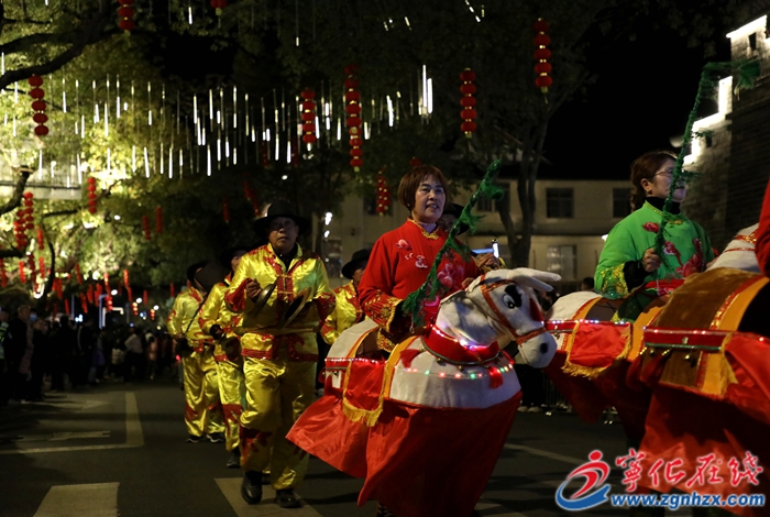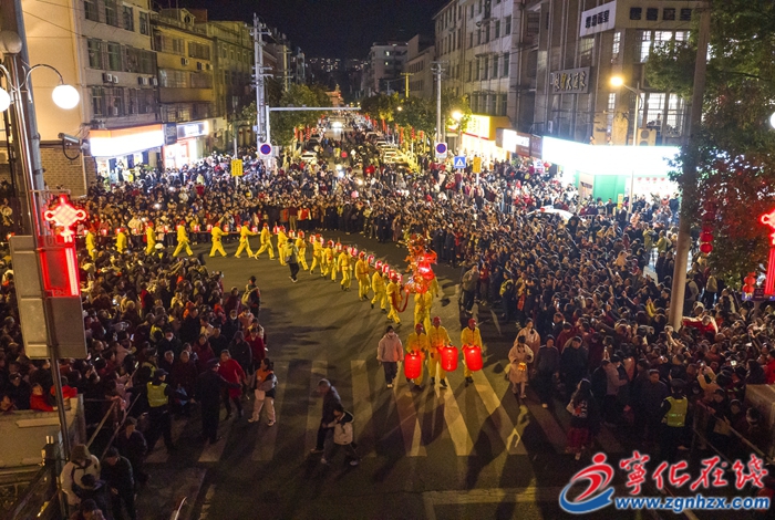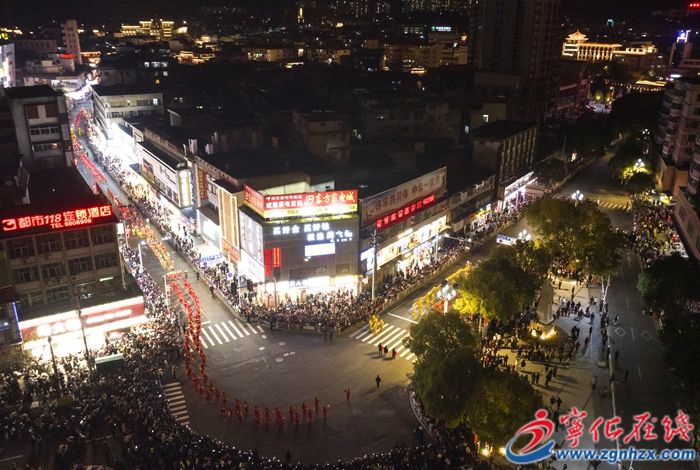 華燈初上,晚上7點(diǎn)30分,各鄉(xiāng)鎮(zhèn)帶來的腰鼓、花燈會(huì)、客家夜迎親、客家團(tuán)牌、石門祁劇、船燈、回回舞、俞家棍、馬燈舞、河蚌舞、舞龍舞獅、牌子鑼鼓等特色非遺項(xiàng)目組成的巡游隊(duì)伍由縣政府門口出發(fā),經(jīng)過壽寧橋、寧陽古街牌坊、南大街、黃慎雕像、新橋、金葉酒店、翠園戲臺(tái),沿城市內(nèi)環(huán)繞圈巡演,只見現(xiàn)場(chǎng)人潮攢動(dòng),巡游隊(duì)伍踩著歡快的鼓點(diǎn),舞動(dòng)鮮艷的紅綢,載歌載舞,馬路兩旁觀眾圍得水泄不通,人們的心被鑼鼓敲得“沸騰”,被龍燈花燈舞得“火熱”,不停地用手機(jī)記錄著精彩瞬間。