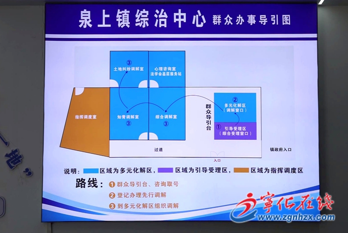 泉上鎮綜治中心整合了司法、公安(派出所)等多部門資源,采用常駐、輪駐等方式集中辦公。中心設有接待大廳、矛盾糾紛調解室、心理咨詢室、法學會基層服務站、指揮調度室。