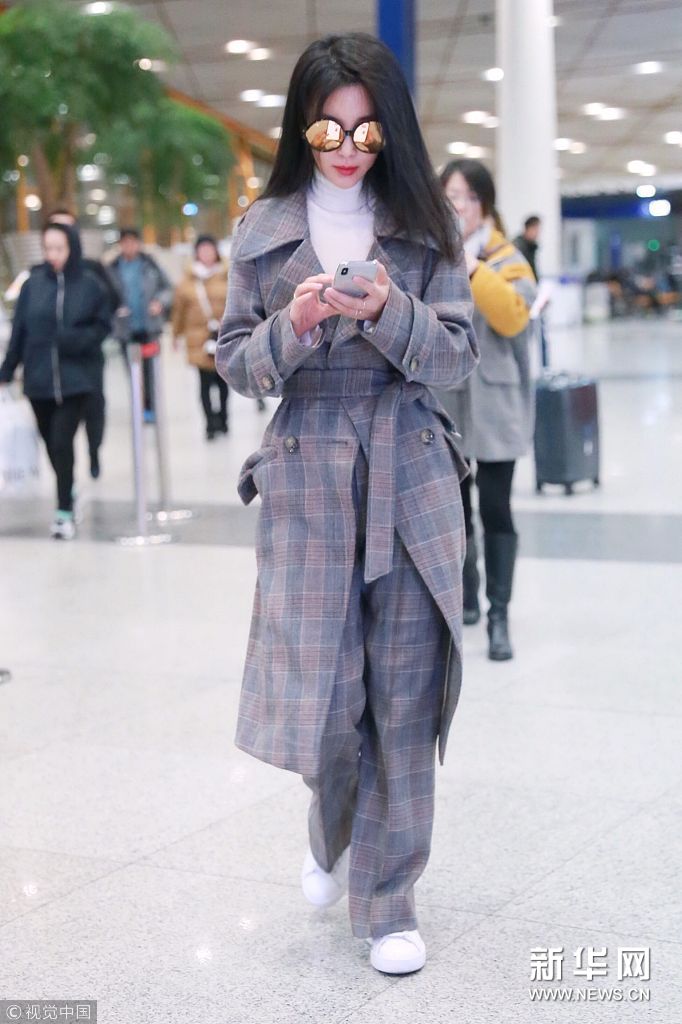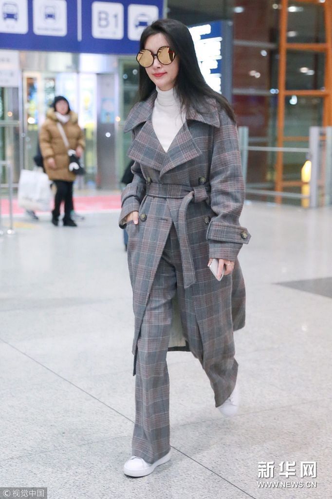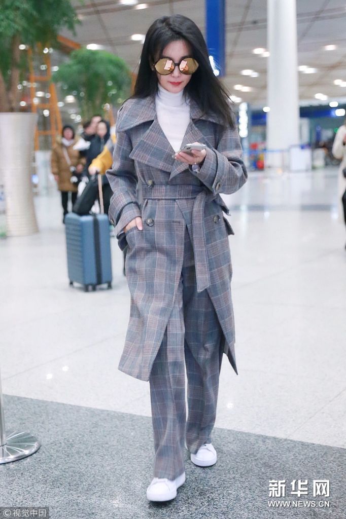 北京,李冰冰現身機場,戴“金屬感”墨鏡英倫范兒足。