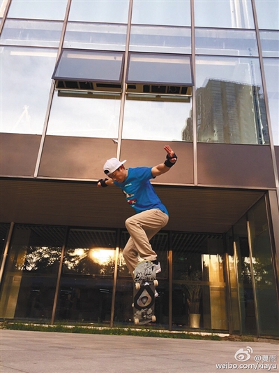 第一個就是滑板。小時候夏雨身體很弱,16歲時他看了一部電影,一幫孩子在玩滑板,整個電影彌漫著一種無拘無束的自由感,他瞬間就喜歡上了這項運動。于是,在他那年生日時從爸爸那里得到了人生的第一塊滑板。在上世紀90年代初,滑板還是一件相當前衛(wèi)的運動,周圍的人看著他滑,會禁不住贊嘆,“一個小孩能在板子上邊滑邊扭,真棒!”因為有了滑板,夏雨的小身板也越來越好了。