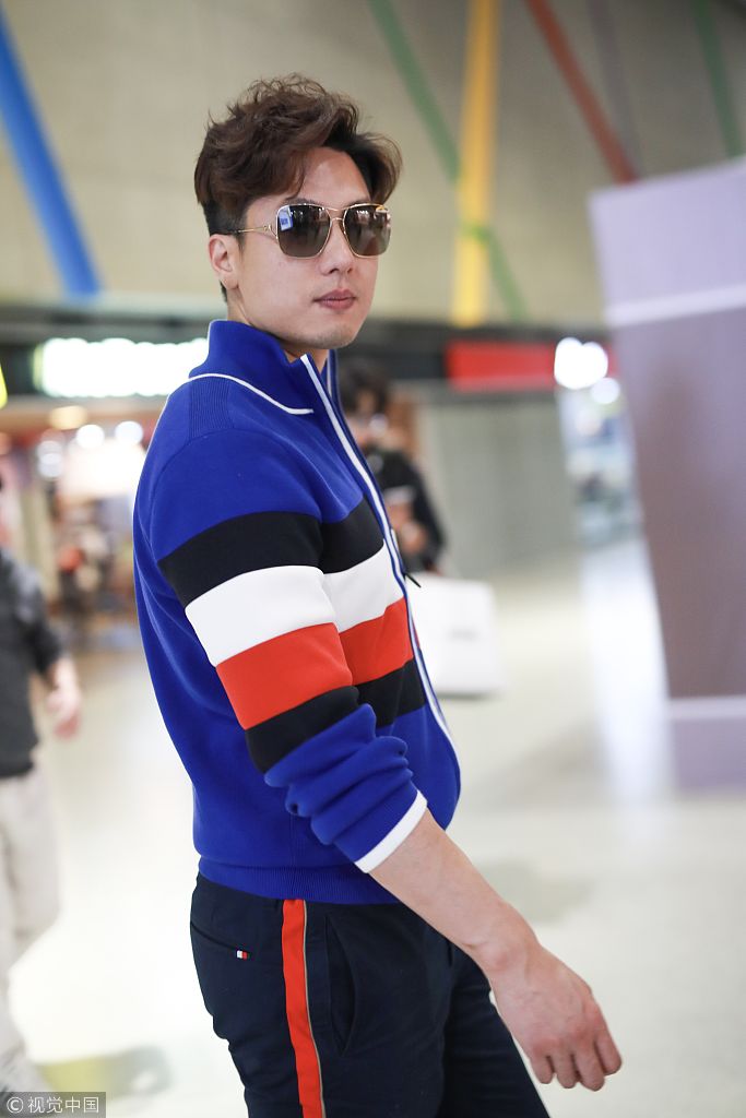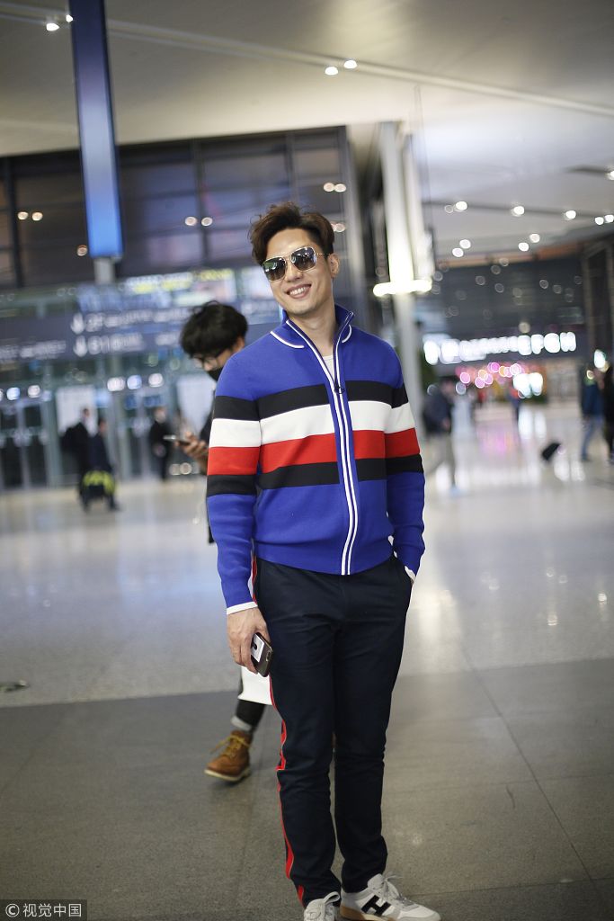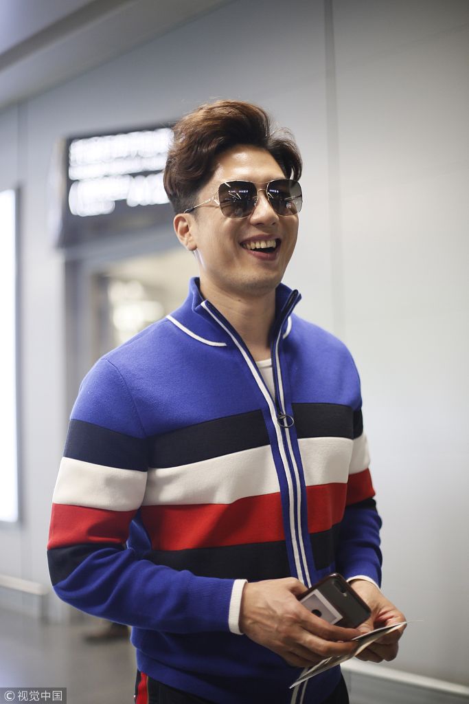上海,凌瀟肅現身機場,穿條紋運動裝 墨鏡遮面難掩好心情。