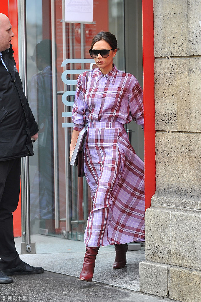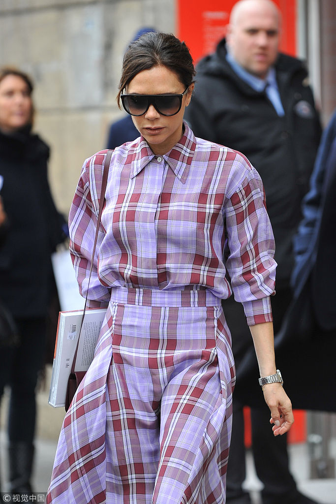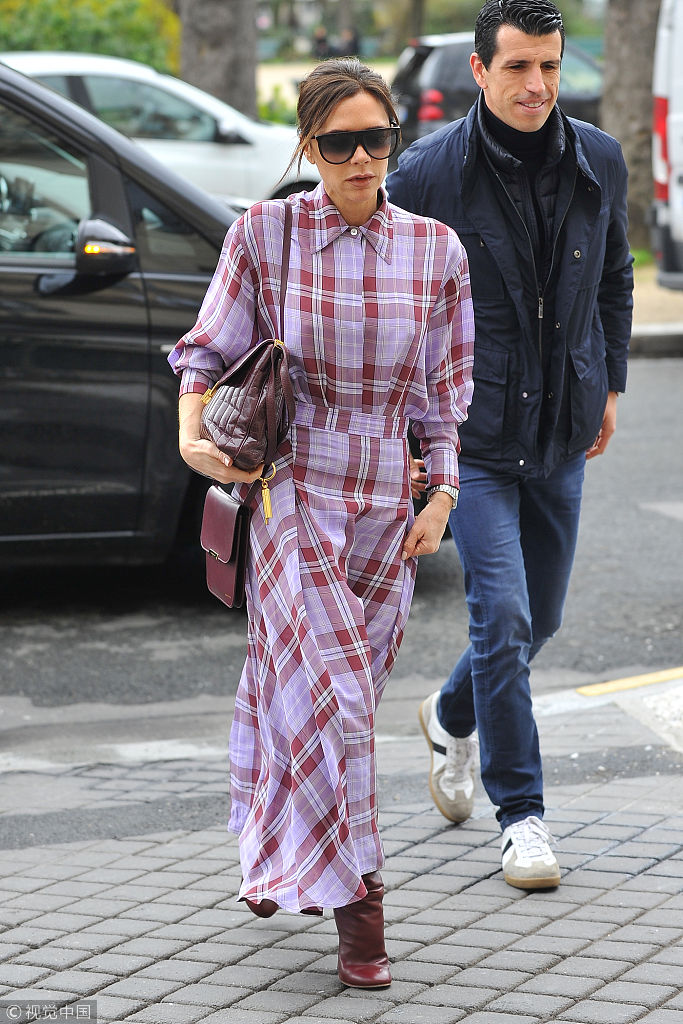 當地時間2018年3月28日,巴黎,貝嫂維多利亞·貝克漢姆(Victoria Beckham)現身參觀比利時著名時裝設計的作品展,格子裙配小紅鞋夠青春。