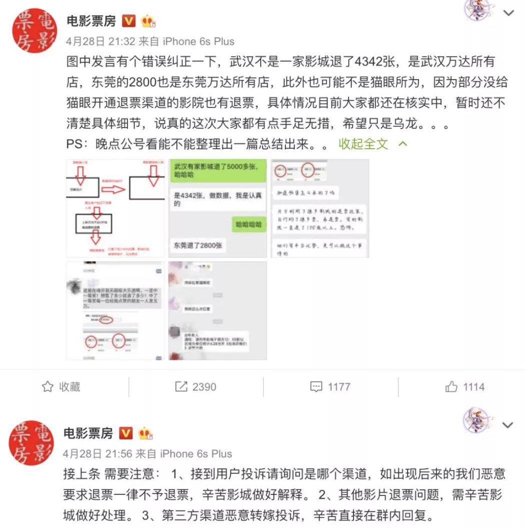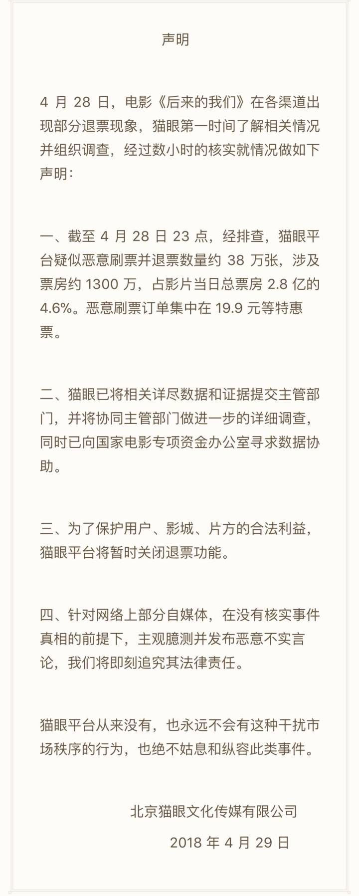 4月29日凌晨,貓眼電影在官方微博正式宣布與此次事件無關:“貓眼平臺從來沒有,也永遠不會有這種干擾市場秩序的行為,也絕不姑息和縱容此類事件。”貓眼方稱懷疑有黃牛亂入作怪,“在4月28日的退票訂單中,有54%屬于用戶正常改簽行為,剩余46%退票訂單,有部分確定為惡意刷票,疑似黃牛行為。”對此聲明,立刻有業內人士表示不可信:“黃牛說”立不住腳,沒有足夠的組織性和資金支持,黃牛豈能能做成如此規模的倒票活動?要真的是已經形成了有這樣資金、資源支持的黃牛組織,那還了得。