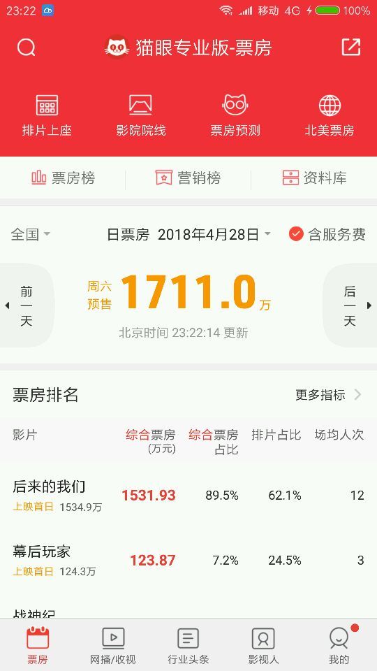 4月28日,《后來的我們》預售票房已經超過1.22億,單日綜合票房拿下2.84億,排片超過45%,上座率45.3%,票房占比達到77%,數據刷新了春節檔后國產電影的單日記錄。