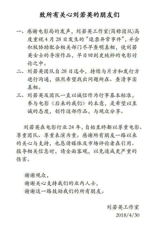 據悉,電影局相關負責人日前已約談出品方、發行方等相關人員,要求盡快完善退票機制,查找其中存在的漏洞,《后來的我們》“退票門”不會就此不了了之。