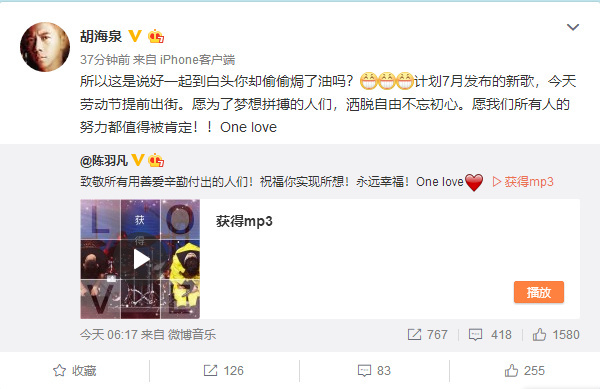 胡海泉隨后轉發并調侃道:“說好一起到白頭你卻偷偷焗了油。”經紀人也透露,歌曲錄制過程中“歷經千辛萬苦”無數次重新錄制,只為呈現最滿意的音樂給大家!