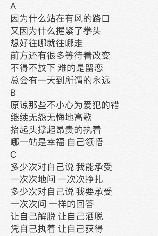 搜狐娛樂訊 2018年5月1日,歌手陳羽凡在微博上發布新歌,歌詞耐人尋味:“原諒那些不小心為愛犯的錯,繼續無怨無悔的高歌”“多少次對自己說我能承受,一次次的問,一次次的掙扎,讓自己解脫,讓自己灑脫,憑自己執著,讓自己獲得”……