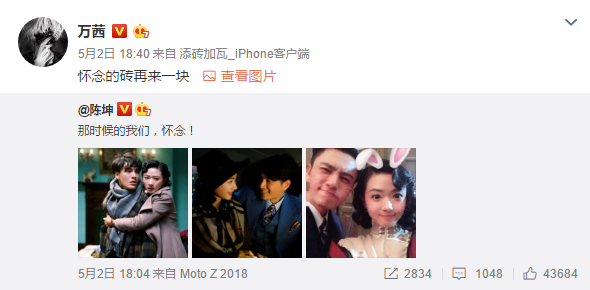 搜狐娛樂訊 5月2日,陳坤更博曬出與萬茜賣萌合照,并配文“那時候的我們,懷念”。隨后,萬茜轉(zhuǎn)發(fā)表示“懷念的磚再來一塊”,并貢獻(xiàn)出一張陳坤搞怪自拍。引得不少網(wǎng)友表示“這波互動感情real鐵了”、“手機(jī)里的存貨都吐出來”。