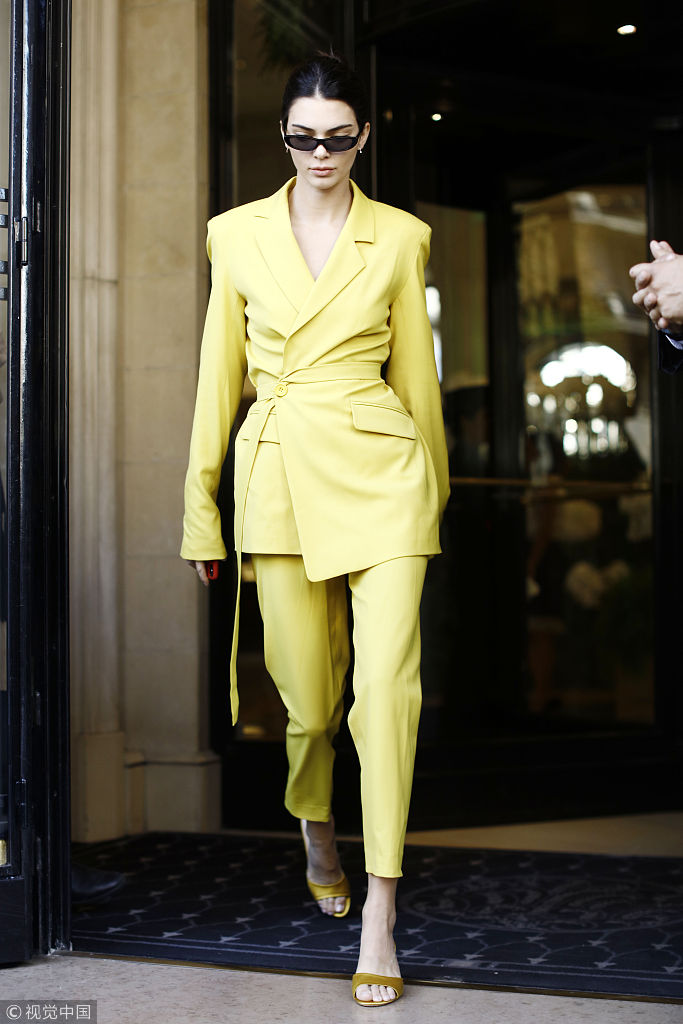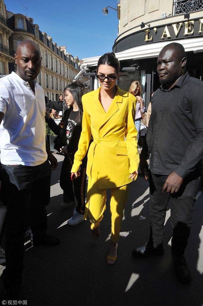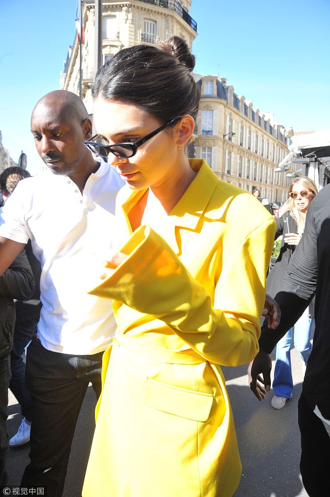 當地時間2018年9月26日,法國巴黎,肯達爾·詹娜(Kendall Jenner)離開酒店現身街頭, 變身“小黃人”秀性感蜂腰, 遇粉絲求合影大方滿足打親民牌。