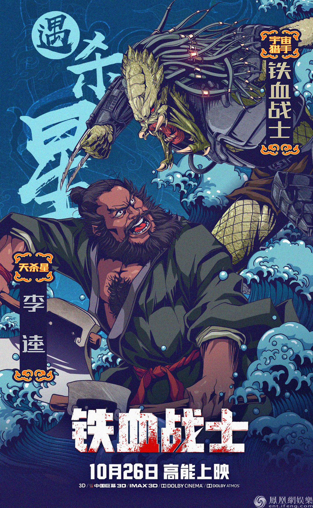 與前兩張海報不同,第三張海報采用了在《水滸傳》中暴躁值滿滿的黑旋風李逵,這位天殺星一言不合就砍人,殺人喝酒是他最簡單的快樂。在海報中,李逵掄著板斧,怒目圓睜,嘴巴極度猙獰,而對面的鐵血戰士氣勢不讓分毫,取下了面具的他青面獠牙,嘴巴更是有吞天之氣魄,周圍的浪花告知二人“猥瑣發育,別浪!”,然而尬表情包的兩位潛臺詞卻是:“來啊!互相傷害啊!”。