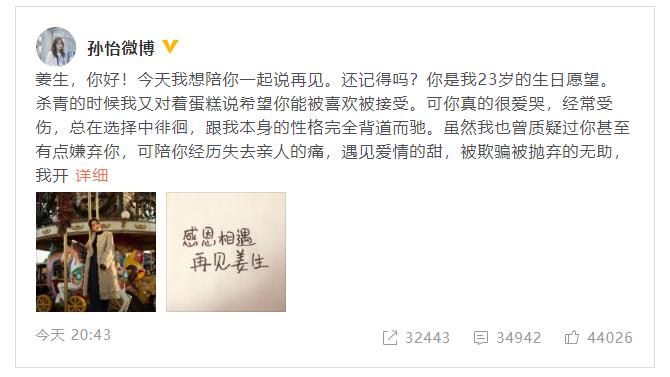 孫怡寫道:“姜生,你好!今天我想陪你一起說再見。還記得嗎?你是我23歲的生日愿望。殺青的時候我又對著蛋糕說希望你能被喜歡被接受。可你真的很愛哭,經常受傷,總在選擇中徘徊,跟我本身的性格完全背道而馳。雖然我也曾質疑過你甚至有點嫌棄你,可陪你經歷失去親人的痛,遇見愛情的甜,被欺騙被拋棄的無助,我開始懂你的猶豫,你的不安,你的等待……我知道這就是你——姜生,你可能沒有那么可愛但卻足夠溫暖。感謝你又是那么幸運,你擁有很多的愛,帶著這些祝福你終于擁抱了自己的幸福,而我也會在我的生活里帶著你給我的祝福繼續努力走下去。感謝我是你,又不是你。再見了,我的老姜!”從剛開始的不完全理解再到接受和領悟,滿滿都是對姜生的注解和追憶。