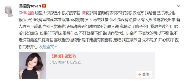 網(wǎng)友回復(fù)道:“新人表現(xiàn)不錯(cuò)了,明星大偵探老粉不要排斥新人,希望更努力表現(xiàn)”、“希望你也別給自己太大壓力,享受和好朋友們錄制節(jié)目的過程”、“多交朋友好好玩兒!譚花很好!”