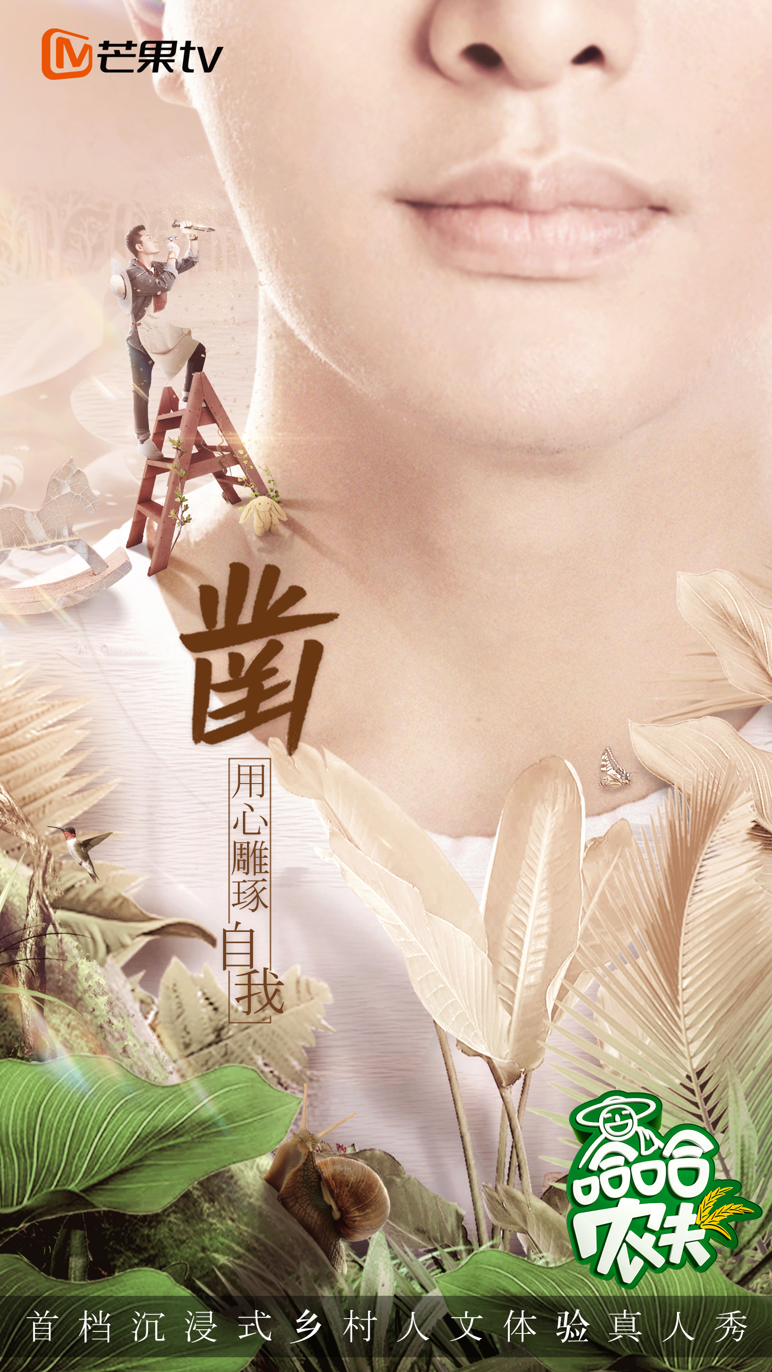 《哈哈農夫》首張嘉賓懸念海報中,男性嘉賓的半張臉充滿半幅畫面,他肩膀上架著的人字梯上則是微縮版的自己,身著工服圍裙、手持錘和鑿,分明是一個木匠形象。海報文案“鑿:用心雕琢自我”一方面對應了微縮小人手中的動作,另一方面似乎是在透露,這是一位不斷嘗試、在角色演繹中自我雕琢的演員。