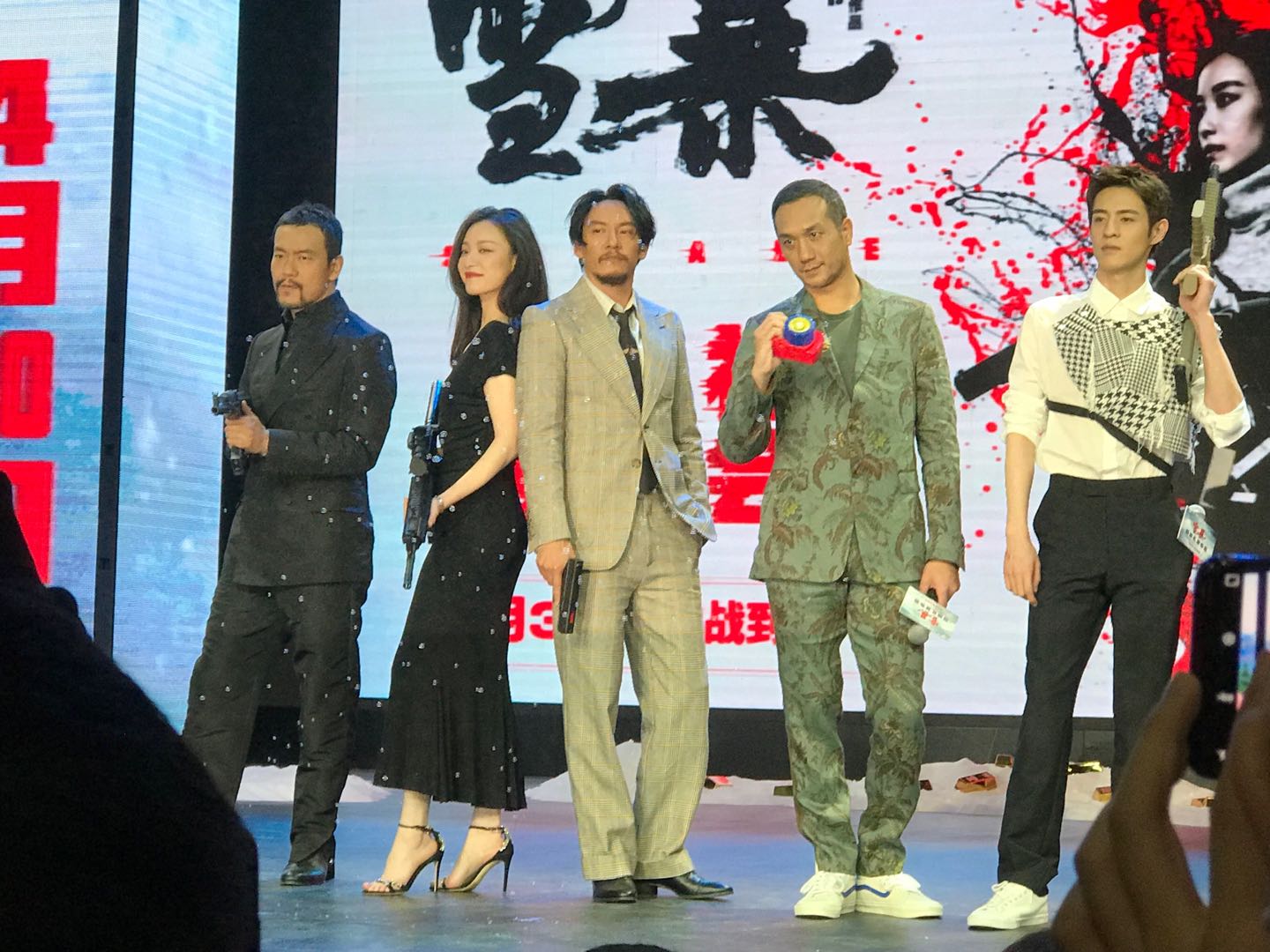 張震和倪妮率先登場,俊男靚女引來臺下粉絲一片尖叫。隨后上臺的“悍匪三兄弟”廖凡、黃覺和張奕聰,自帶“匪氣”震懾全場。電影里,警匪不共戴天,戲外演員們卻其樂融融,在舞臺上打成一片。