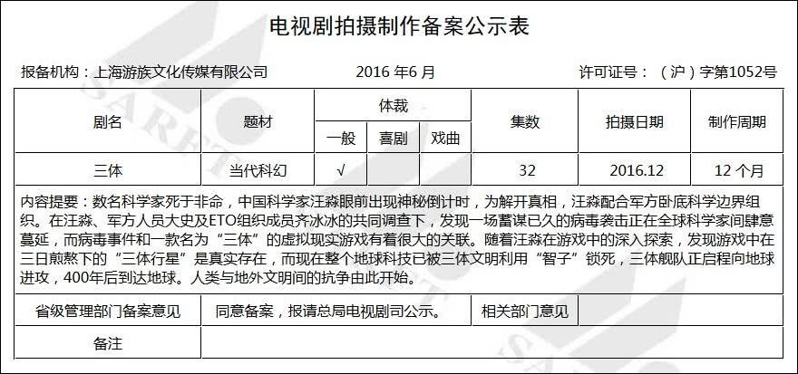 電視劇《三體》通過(guò)備案,報(bào)備機(jī)構(gòu)還是游族