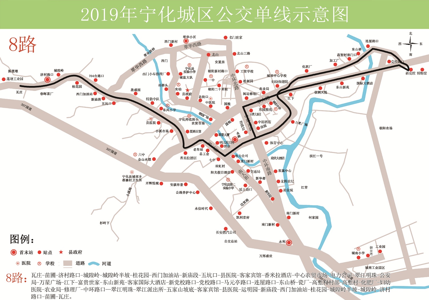 8路 | 瓦莊—縣醫(yī)院—老車(chē)站—中環(huán)路—天鵝酒店—客家國(guó)際—連屋路口—化肥廠(chǎng)—萬(wàn)星廣場(chǎng)—老車(chē)站—縣醫(yī)院—瓦莊 | 07:00 | 19:30 | 全天運(yùn)行時(shí)間13小時(shí) | 7:00—12:20 | 7分鐘 | 7分鐘 | ||