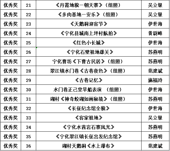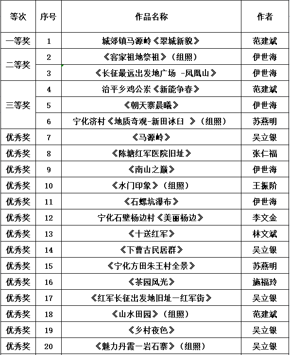 由縣文旅局、縣文聯聯合舉辦的“好客寧化? 四季之約”寧化網紅打卡地作品征集活動截止2022年12月31日,共收到397張攝影單圖,66組444張組圖,22個短視頻,本次參與評選照片總計841張,短視頻22個。組委會對所有來稿進行隱名編號,經過初評、復評,評出攝影類36件作品,其中一等獎1名、二等獎2名,三等獎3名,優秀獎30名。短視頻類因投稿量少且未達到主辦方要求,所以不予評定等次。