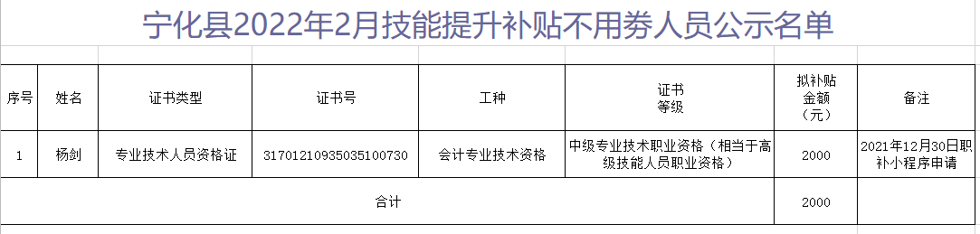 ◎?qū)幓h2022年2月失業(yè)保險(xiǎn)支持參保職工提升職業(yè)技能補(bǔ)貼不用劵信息公示