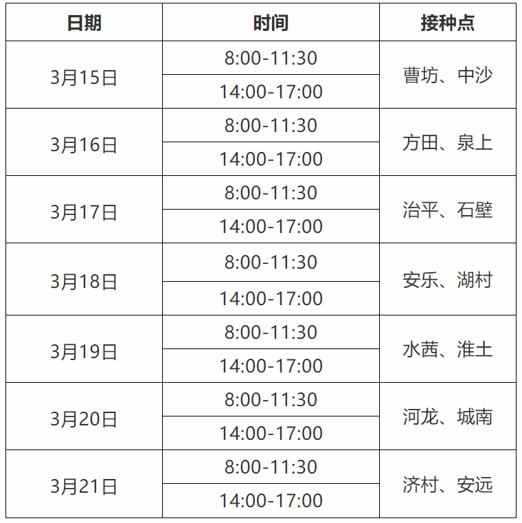 根據市新冠病毒疫苗接種工作總體安排,現將我縣3月15日-3月21日新冠病毒疫苗接種安排如下: