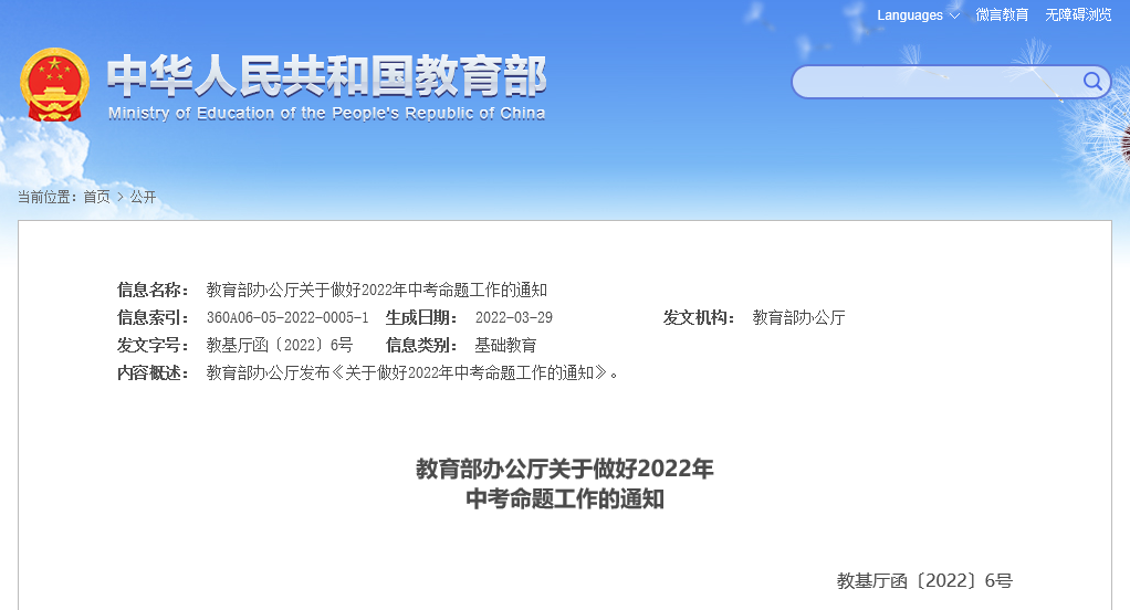 教育部辦公廳關于做好2022年中考命題工作的通知