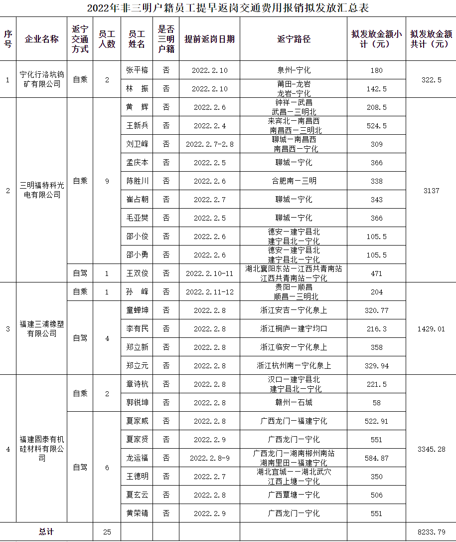 根據(jù)《寧化縣人民政府關(guān)于印發(fā)寧化縣促進(jìn)企業(yè)穩(wěn)崗穩(wěn)工十條措施的通知》(寧政文〔2022〕8號)文件精神,經(jīng)人社局、工信局和財政局對企業(yè)申報材料進(jìn)行審核,確定符合2022年非三明戶籍員工提早返崗交通費(fèi)用企業(yè)4家共計25人,自乘員工按車票金額報銷,自駕員工按過路費(fèi)票據(jù)金額報銷,擬發(fā)放金額8233.79元。詳情見附件。現(xiàn)將有關(guān)信息進(jìn)行公示。