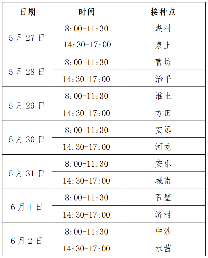 根據市新冠病毒疫苗接種工作總體安排,現將我縣5月27日-6月2日新冠病毒疫苗接種安排如下: