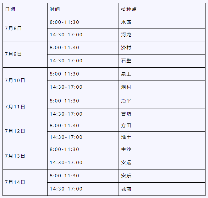 根據市新冠病毒疫苗接種工作總體安排,現將我縣7月8日-7月14日新冠病毒疫苗接種安排如下: