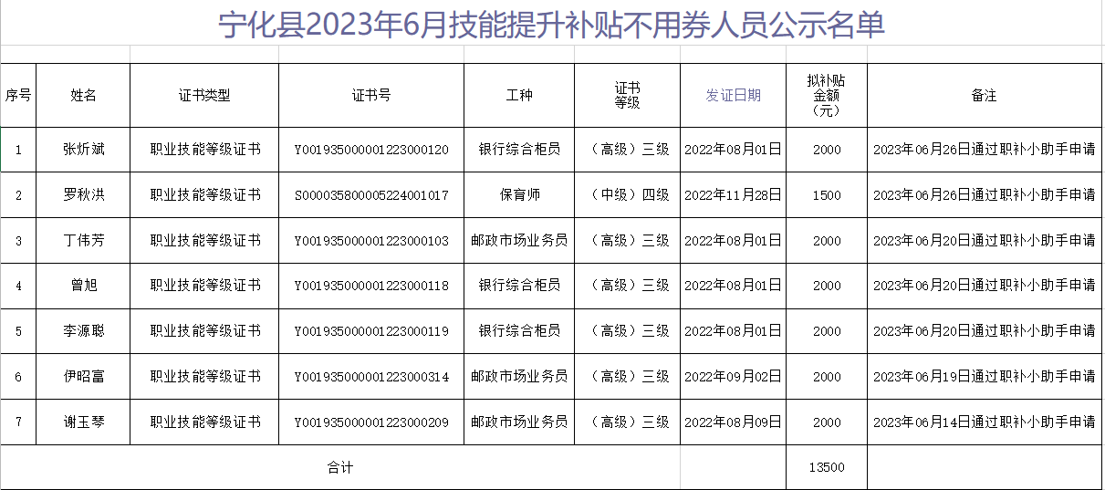 根據《福建省人力資源和社會保障廳福建省財政廳關于印發福建省失業保險支持參保職工提升職業技能實施辦法的通知》(閩人社文〔2017〕192號)、《三明市人力資源和社會保障局 三明市財政局關于進一步做好失業保險技能提升有關工作的通知》(明人社〔2019〕213號)文件精神,經寧化縣勞動就業中心初審、我局復審以下7名符合享受職業技能提升補貼條件,現予以公示,公示時間為期7天:2023年7月18日—7月24日,歡迎群眾監督,對公示內容如有異議,可通過公示電話或來信來訪進行反映。電話:6823905(縣人社局辦公室)、6659221(派駐財政紀檢組)。