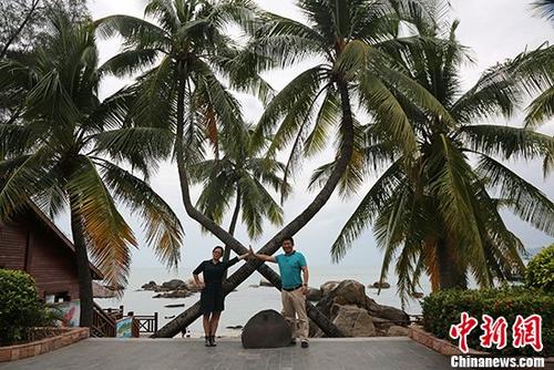 資料圖:游客在海南三亞天涯海角游覽區(qū)內(nèi)的情侶樹前合影。 中新社記者 尹海明 攝