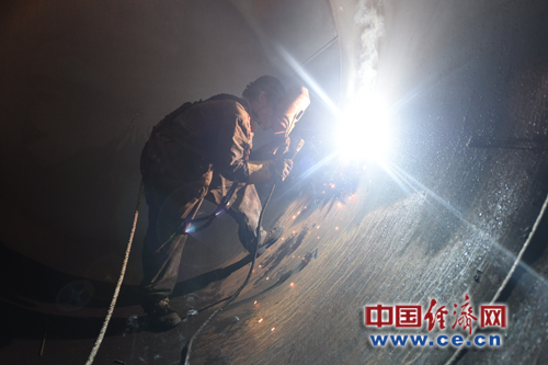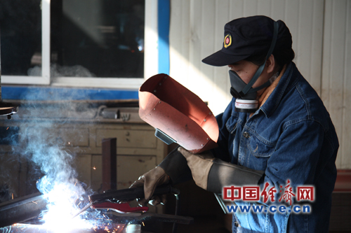 溫素霞在焊接貨車車門。經(jīng)濟日報-中國經(jīng)濟網(wǎng)記者佟明彪/攝