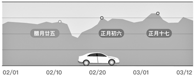 從出行趨勢圖可以看出,春節前的返鄉高峰集中在臘月二十五,這一天有超過90萬人在回家的路上。返程則有兩個明顯的出行高峰:第一個返程高峰出現在正月初六,部分車主和乘客會選擇在春節長假結束前一天返回工作城市;另一個高峰則是正月十七,這一天正好是周日,可見有不少人選擇在家度過元宵節后再返回工作城市。