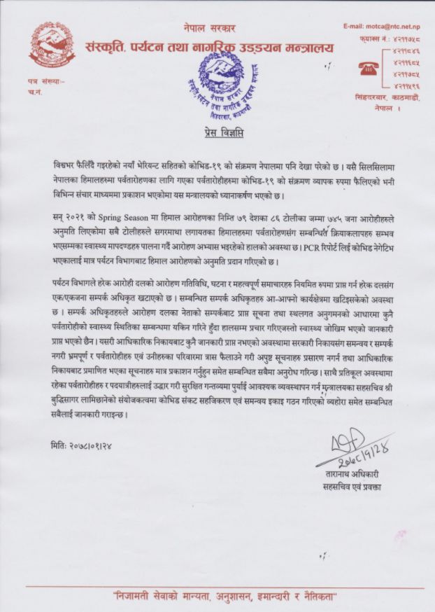 尼泊爾文化、旅游與民航部要求媒體不要發(fā)表未經(jīng)官方機構(gòu)證實的報道,不要在沒有和官方機構(gòu)溝通協(xié)調(diào)的情況下隨意發(fā)表言論,不要給登山者和他們的家庭帶來傷害。